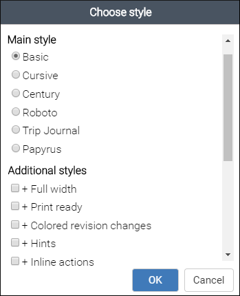 Oxygen XML Web Author has an option to adjust the rendering of documents simply by choosing from various styles. Each style is based on a corresponding CSS file stored in the built-in DITA framework. There are numerous different styles available for DITA documents. You can choose one main style and multiple additional styles that act as layers, with choices such as switching to a full width mode, a print preview mode, or adding inline hints to help you understand the type of content that is expected within the DITA structure.