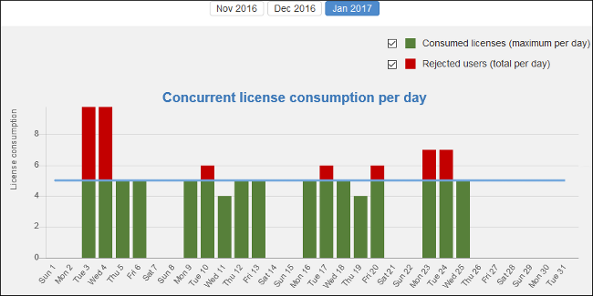 Concurrent license consumption per day - A chart that shows the peak number of licenses that were consumed and the total number of users that were rejected, on a daily basis. This chart can be used to detect the amount of concurrent licenses that are needed to avoid having rejected users.Tip: You can click on any bar to see the license consumption per hour for that particular day.