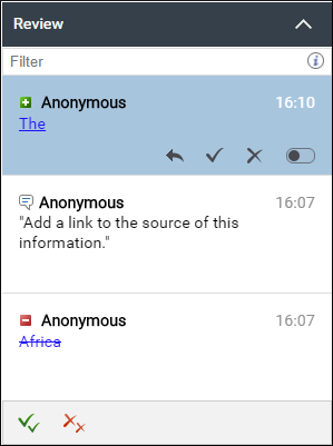To filter the comments and changes (for example, to only show items for a particular author or to only show a certain type of review item), enter queries in the text filter at the top of the panel.