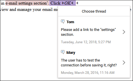 When you hover over a spot that contains multiple commented or changed text areas, the tooltip displays the list of threads available in that area.