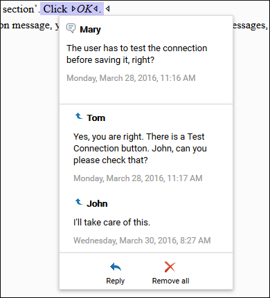 box will be displayed that allows you to add your reply. - Select OK to add your reply to the comment thread. The replies are displayed with an indentation in the Review panel.
