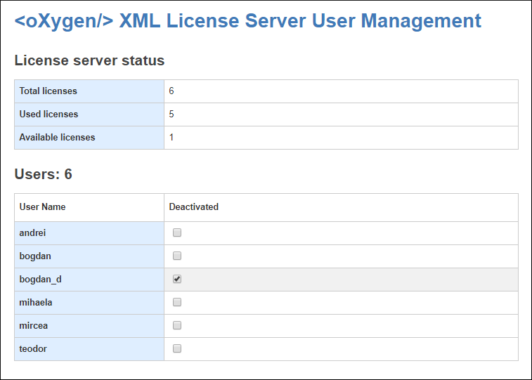This page provides access to several statistics reports and management tasks. It also shows the current status of the server and provides additional instructions for using the license server with Oxygen XML Web Author.