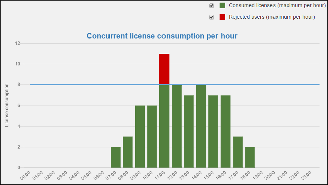 Concurrent license consumption per day - A chart that shows the peak number of licenses that were consumed and the total number of users that were rejected, on a daily basis. This chart can be used to detect the amount of concurrent licenses that are needed to avoid having rejected users.Tip: You can click on any bar to see the license consumption per hour for that particular day.
