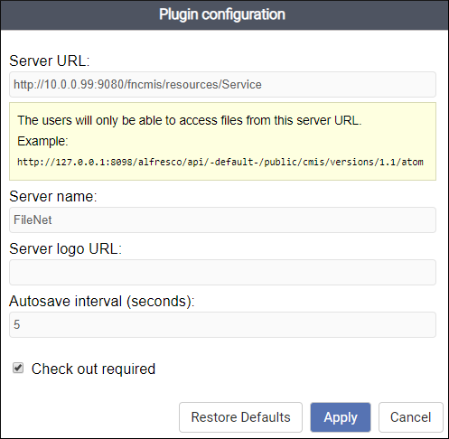 Configure icon next to the CMIS plugin.Step Result: This opens the plugin configuration dialog box.