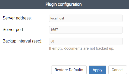 - Enter the Server address and Server port. The Backup interval (sec) setting is optional and it can be used to configure the time interval for how often documents will automatically be backed up. Leave this field blank if you do not want documents to be backed up automatically.