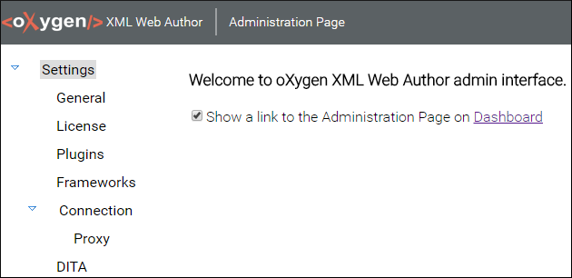 Oxygen XML Web Author includes a user-friendly Administration Page that helps you to configure your instance of Oxygen XML Web Author. You can use this page to configure a variety of settings. You need to enable the Administration Page before you can access it, but once you do, you can access it from a link on the top-right corner of the Dashboard page.